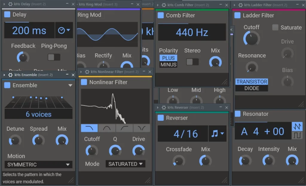 各プラグインは非常にシンプルで軽量ながら、クリアで高品位なサウンドが特徴です。特に、同社のモジュラーシンセ「Phase Plant」やホストプラグイン「Snap Heap」と組み合わせることで、その真価を最大限に発揮します。