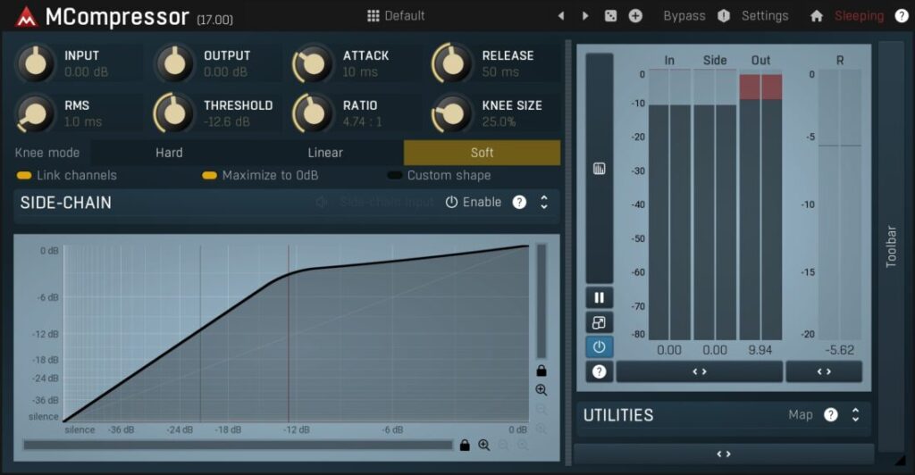 音質は非常に素直で、どんなソースにも使えます。MeldaProductionの無料バンドルに含まれており、このプラグインで基本操作をマスターすれば、どんな有料コンプレッサーも扱えるようになるでしょう。