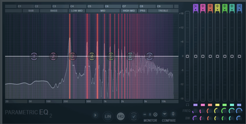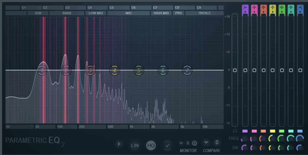 次に、楽器の「胴鳴り」や存在感を少し加えたい場合、100Hzから150Hzあたりを狭いQ幅(ピンポイント)でわずかにブーストすると、どっしりとした安定感が得られることがあります。ただし、ブーストしすぎると不自然になるので注意が必要です。