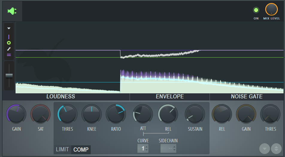• 速めのアタック(例: 1ms~10ms程度): トランジェントをしっかりと抑え込み、よりスムーズで均一な音量感を得たい場合に有効です。ただし、速すぎるとアタック感が失われ、音が引っ込んで聴こえることがあります。サスティンが長いレガート奏法などでは比較的速めのアタックが合うこともあります。